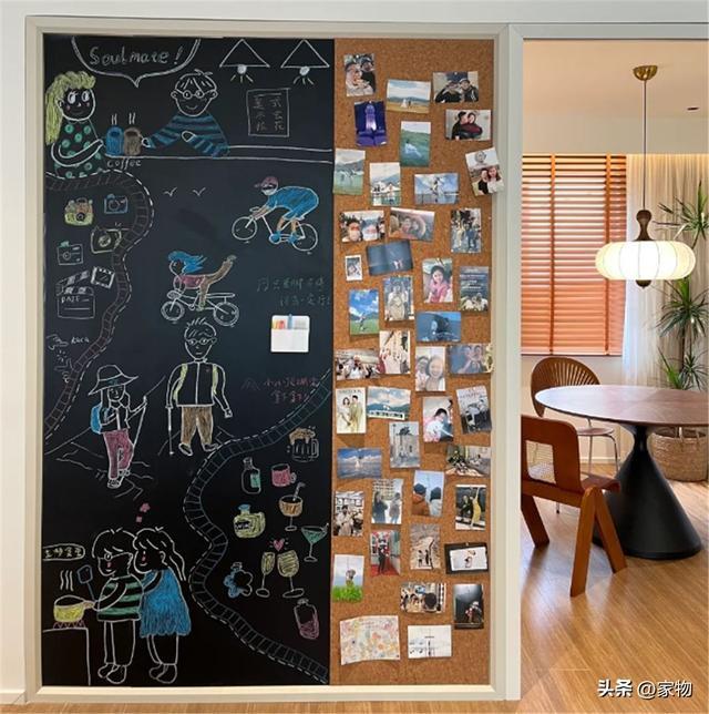 最后,有小朋友的家庭,建议做个磁吸式的黑板墙/白板墙,既可以当做日常的磁吸备忘录,又可以给孩子多一个涂鸦的空间,让他别去祸祸家里其他的墙面。